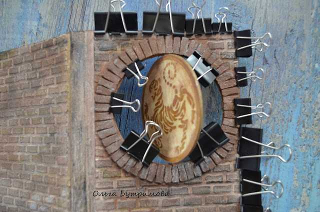 для создания "наличника", все той же пастой делаю кирпичную кладку, крашу акрилом,